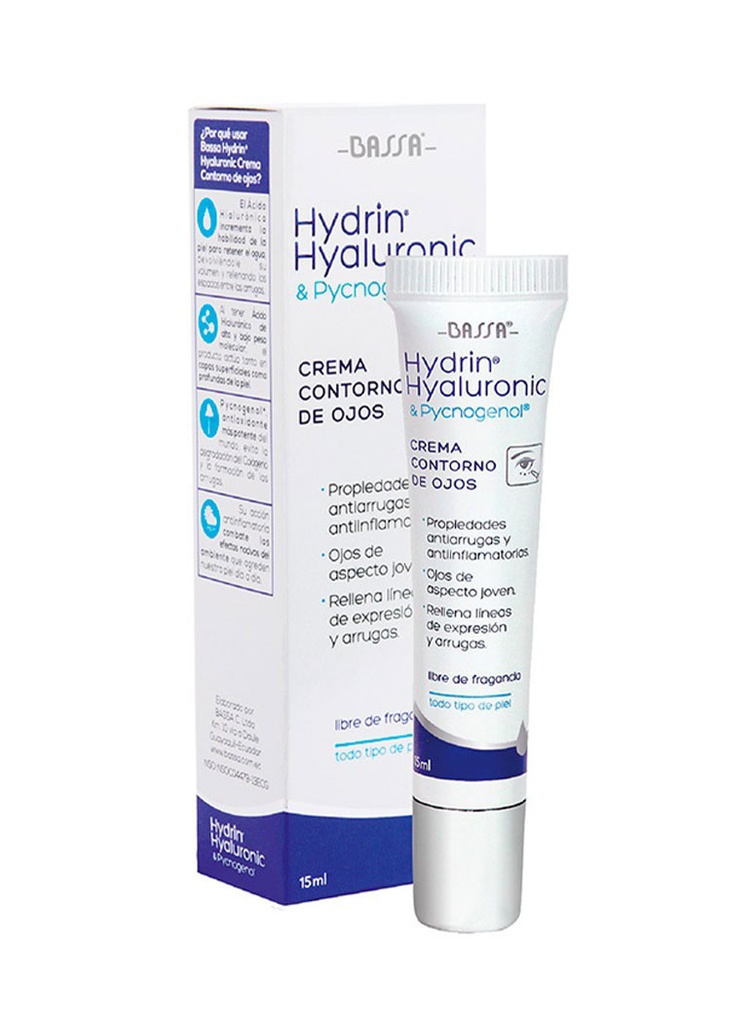 Producto SKU: CON218Bassa Hydrin Hyaluronic Crema Contorno de Ojos es un producto ligero, no grasoso, formulado para disminuir la aparición de bolsas debajo de los ojos, ojeras y líneas de expresión. Único con fórmula efecto por 3, hidrata, desinflama y renueva la delicada piel del contorno de ojos, brindando una apariencia radiante y fresca gracias a la combinación de Ácido Hialurónico más su acción antioxidante.